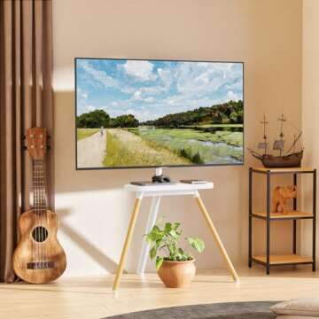 Show more This innovative tripod TV stand redefines the viewing experience by transforming your flat-screen TV into a chic easel. With a sophisticated and imaginative design, this easel stand is perfect for various environments, whether it be a studio, bachelor apartment, living room, bedroom, corner space, or office. Designed with functionality and style in mind, it not only supports your TV but also enhances your decor. Conveniently portable, it's compatible with most TVs ranging from 42 to 65 inches and weighing up to 99 lbs, thanks to its versatile VESA patterns.