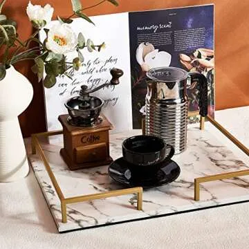 Show more Introducing the exquisite handmade marble tray from PuTwo, crafted with care to bring you a blend of elegance and functionality. This stunning marble printed vanity tray is adorned with durable metal handles and features a tasteful PU leather finish, giving it the look of real marble while being significantly lighter and more resilient than stone alternatives. Whether you’re organizing your jewelry, displaying your favorite perfumes, or simply looking for a chic way to elevate your home decor, this tray serves a multitude of purposes with style.