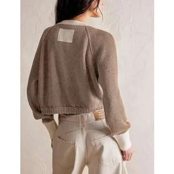 PUWEI Women's Cropped Cardigan Sweaters Casual Long Sleeve Button Up Cardigans Color Block Crewneck Knit Outwear Jackets (Khaki-S)