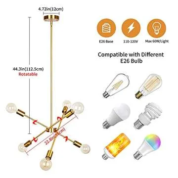 Enhancing any interior, this light fixture is perfect for illuminating a variety of spaces including your living room, dining room, and kitchen island, as well as cozy settings like cafes and bars. The chandelier requires six E26 bulbs, offering compatibility with incandescent, halogen, LED, or CFL options, all of which can illuminate your space in a warm, inviting glow. The dimmable feature allows you to create the perfect atmosphere for any occasion, adaptable from vibrant dinner parties to relaxing evenings.
