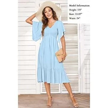 Show more Introducing the PYGFEMR Women’s 2024 Summer Dresses Sun Dress, the perfect blend of comfort, elegance, and chic style for the modern woman. This stunning midi dress showcases a dreamy light blue hue that captures the essence of summer. Crafted with a delicate smocked tiered design and a flattering v-neckline, this dress not only liberates your silhouette in a tasteful way but also adds a touch of playful femininity. Its flutter sleeves and classy flow ensure you look both beautiful and sophisticated, whether you're heading to the beach or enjoying a romantic evening out. Experience the ethereal vibes of this gorgeous piece that transforms any occasion into a stylish event.