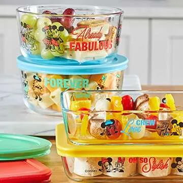 Pyrex 8-Pc Glass Food Storage Container Set, 4-Cup & 3-Cup Decorated Round Meal and Rectangle Prep Containers, Non-Toxic, BPA-Free Lids, Disney Mickey & Friends
