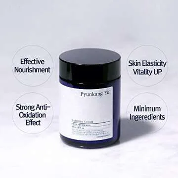 Show more Discover the power of hydration with the PYUNKANG YUL Nutrition Cream, a meticulously crafted face moisturizer designed to provide intensive nourishment without overwhelming your skin. This cream is perfect for all skin types, but especially beneficial for those dealing with rough and dry skin. With a philosophy rooted in enhancing the fundamental causes of skin discomfort, this product employs a minimalist approach to allow your skin to breathe while delivering essential moisture. Made with nature's finest ingredients, this cream boasts hyaluronic acid for unrivaled hydration, sheabutter to soften, and macadamia seed oil to balance moisture levels. Each application unveils a complexion that feels revitalized and smooth.