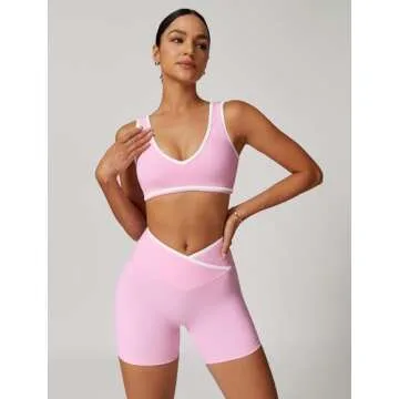 QBGJTD Two Piece Workout Sets for Women V Neck Color Block Crop Tank Sports Bra Matching High Waist Booty Lifting Biker Shorts 2 Piece Gym Yoga Active Wear Outfits Womens Athletic Work Out Pink M