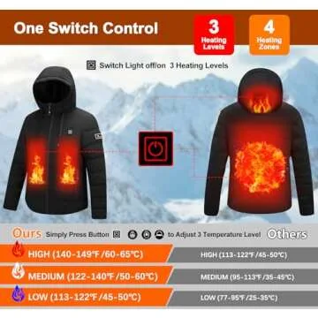 This innovative jacket comes equipped with **4 heating areas** including the left and right abdomen, back, and nape, thanks to cutting-edge carbon fiber heating technology. The jacket heats up quickly, providing targeted warmth where you need it most. Plus, the **3 heated temperature settings** – high (red at 60°C/140°F), medium (blue at 50°C/122°F), and low (green at 40°C/104°F) – allow you to adjust the heat to your comfort level. Whether you're heading out for a ski adventure or simply running errands on a chilly day, this jacket adapts to your needs effortlessly.