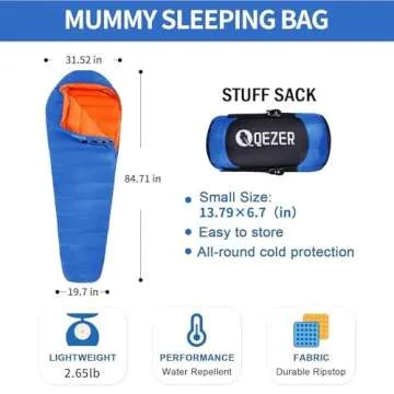 QEZER Down Sleeping Bag for Adults 32 Degree F Backpacking Sleeping Bag with 600 FP Down Ultralight Mummy Sleeping Bag with Compression Sack(RoyalBlue)