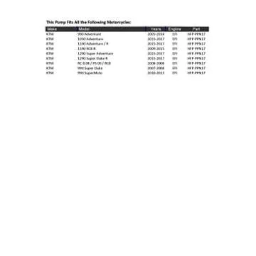 Show more Introducing the perfect replacement fuel pump for your motorcycle, designed to deliver reliable performance and exceptional durability. This high-quality component is compatible with a range of KTM models, including the iconic 990 Dakar and the powerful 1290 Super Duke R. Crafted with precision, this fuel pump guarantees optimal fuel flow and efficiency, ensuring your ride stays smooth and powerful. Whether you’re cruising down the highway or tackling rugged terrains, you can trust this pump to keep your engine running optimally.