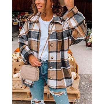 Qiaomai Womens Fall Shacket Jacket Plaid Flannel Wool blend Button Down Shirt Coats (#1Khaki-L)