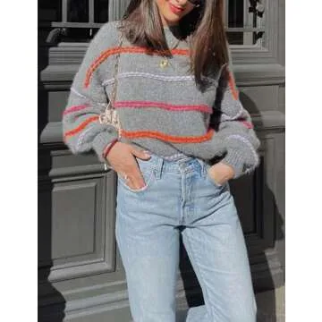 QIBABU Womens Striped Sweaters Casual Lantern Sleeve Color Block Knit Pullover Sweater Tops(2136-Grey-S-QB)