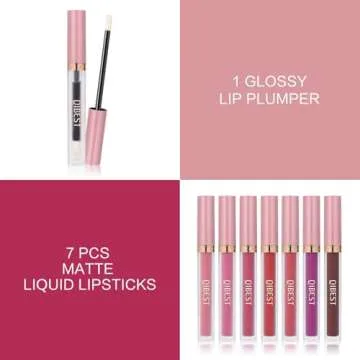 QiBest 7Pcs Matte Liquid Lipstick and 1Pcs Lip Plumper Makeup Set, Pigmented Waterproof Halloween Lip Make Up Valentine's Gift Lip Gloss Sets Long Wearing Velvet Lip Kit for Teens & Women