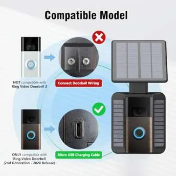 Show more Introducing the ultimate solution to your doorbell power woes, the innovative Solar Panel Charger designed specifically for the Ring Video Doorbell (2nd Generation - 2020 Release). This environmentally friendly solar charger eliminates the hassle of constant battery changes, providing a continuous and reliable power source for your doorbell. What sets this product apart is its impressive 365-day power supply, which ensures your doorbell remains operational throughout the year without the traditional hassle of wiring. With a powerful output of maximum 2.9W 5V DC and an efficiency rate of 19%, this charger guarantees stable power dispensing to keep your doorbell always ready.