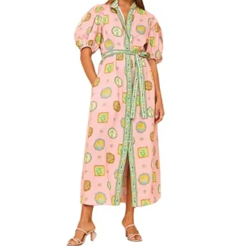 Qikaka Women's Half Puff Sleeve Lapel Button Printed Bodycon Sexy Nightclub Vacation Belted Dress Pink