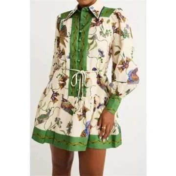 Qikaka Women's Long Puff Sleeve Lapel V Neck Button Printed Bodycon Sexy Nightclub Party Holiday Dress
