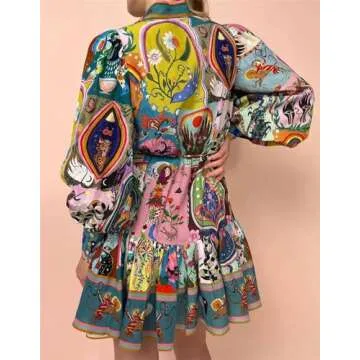 Qikaka Women's Long Puff Sleeve Turtleneck Printed Button Bodycon Sexy Nightclub Party Blouse Dress Small