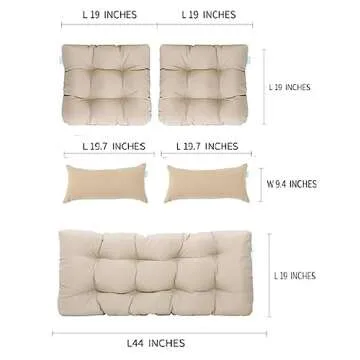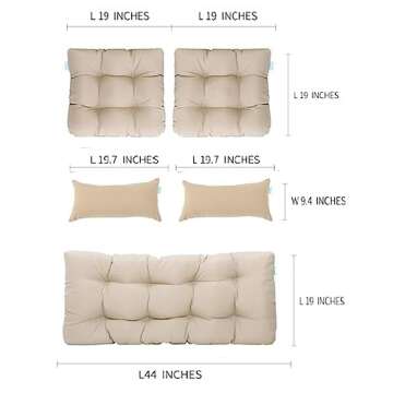 Show more Transform your outdoor space with the QILLOWAY Outdoor Patio Wicker Seat Cushions Group. Designed for style and comfort, this exquisite cushion set includes five pieces: a luxurious loveseat cushion measuring 19"x44"x5", two U-shape seat cushions at 19"x19"x5", and an additional two lumbar pillows sized 9.4"x19.7". Each cushion is made from thick stuffing and high-quality fabric, ensuring durability and comfort for all your outdoor lounging needs.