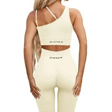 QINSEN High Waisted Leggings Women Exercise Outfits 2 Pieces Yoga Sports Bra with Leggings Set Beige M