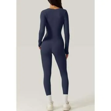 QINSEN Woman's Long Sleeve Square Neck Bodysuit Tummy Control Long Leggings Jumpsuit Navy M
