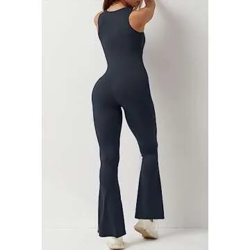 QINSEN Woman's Stretch Square Neck Long Pants Jumpsuit Slimming Fit Curvy Flare One Piece Outfits Romper Grey Navy S