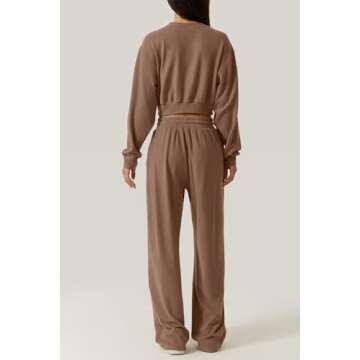 QINSEN Women 2 Piece Outfits Sweatsuit Set Twist Front Cropped Sweatshirt Wide Leg Sweatpant Lounge Set Tracksuit Caramel M
