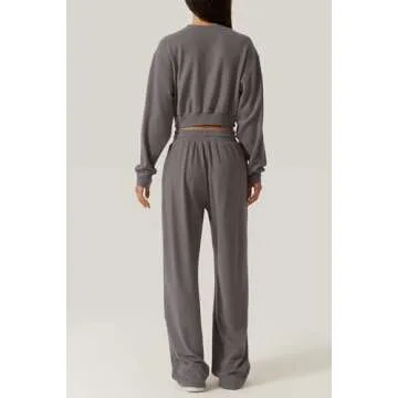 QINSEN Women 2 Piece Outfits Sweatsuit Set Twist Front Cropped Sweatshirt Wide Leg Sweatpant Lounge Set Tracksuit Blackened Peal S