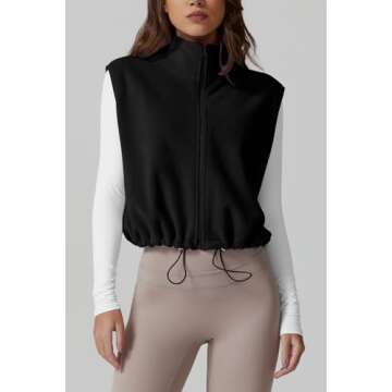 The unique short fleece vest design, measuring 20 inches from shoulder to hem, combines a full zip up feature with a high neck for optimal coverage against the chill. Its bungee at the hem works diligently to keep the cold air out while offering a trendy, baggy look. This cropped length vest is perfect to pair with jeans, leggings, or any favorite pants, giving you a fashionable silhouette.