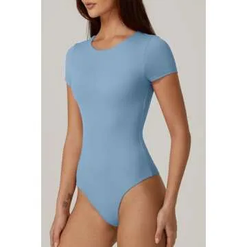 QINSEN Women's Sexy Crewneck Bodysuit Short Sleeve Double Lined Shirt Tops Light Airy Blue S