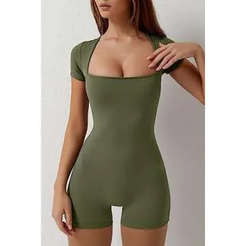 QINSEN Women's Sexy Square Neck Unitard Bodysuit Bodycon Stretchy One Piece Jumpsuits Shorts Rompers Olivine M