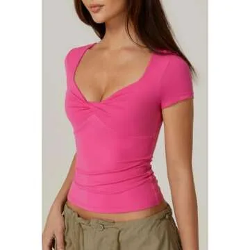 QINSEN Women's Sexy Twist Front V Neck T Shirts Double Lined Short Sleeve Crop Top Trendy Y2K Going Out Tops Magenta S