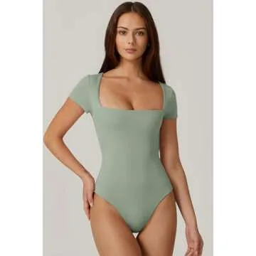 QINSEN Women's Square Neck Bodysuit Sexy Curved Shoulders Short Sleeve Slimming Tops Smoke Green XS