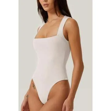 QINSEN Women's Square Neck Sleeveless T Shirt Tank Top Seamless Tummy Control Bodysuits Beige S