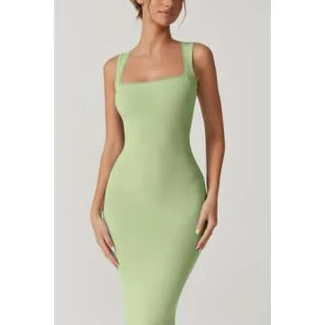 QINSEN Women's Square Neck with Lace Detail Long Maxi Dress Sleeveless Lounge Ribbed Full Length Dresses Green XS
