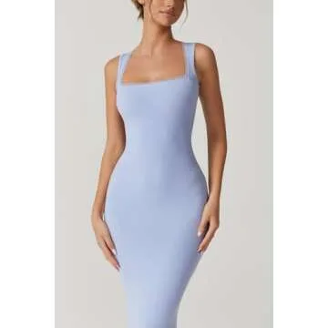 QINSEN Women's Square Neck with Lace Detail Long Maxi Dress Sleeveless Lounge Ribbed Full Length Dresses Blue M