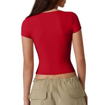 QINSEN Women's V Neck Short Sleeve T Shirts Double Lined Tee Seamed Cup Going Out Tops Red S