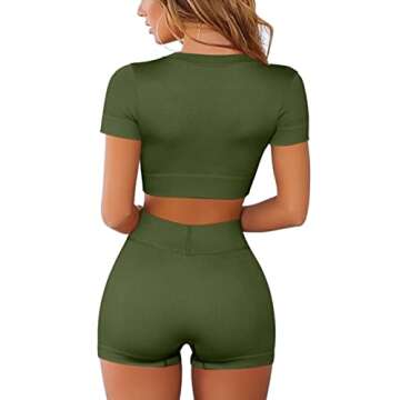 Show moreIntroducing the QINSEN Women Workout Tops, the perfect blend of style and functionality that every fitness enthusiast needs! Crafted with premium quality fabrics, these sexy V neck short sleeve crop tops provide a flattering fit while offering optimal breathability during your workouts. Designed specifically for women, the tummy control shorts ensure you feel confident and look great whether you are hitting the gym, going for a run, or enjoying a casual day out. The versatile army green color adds an element of chic, making it easy to mix and match with your favorite workout gear.