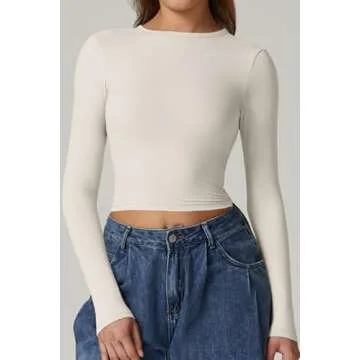 QINSEN Womens Criss Cross Backless Top Long Sleeve Double Lined Slimming Fit T Shirts White S