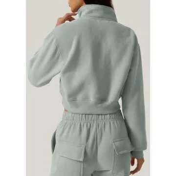 QINSEN Womens High Neck Stand Collar Pullover Half Zip Long Sleeve Crop Sweatshirt Green M
