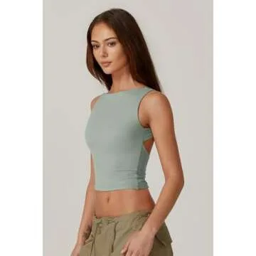 QINSEN Womens Sleeveless Double Lined Tank Tops High Neck Open Back Crop Tees Summer Y2K Tops Smoke Green L