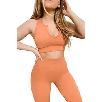 QINSEN Workout Outfits for Women 2 Piece Ribbed Seamless Crop Tank High Waist Yoga Leggings Sets (XS, Light Orange)