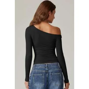 QINSEN Y2k Tops for Women One Shoulder Long Sleeve Slim Fit Tees Double Lined Ruched Crop Tees Black M