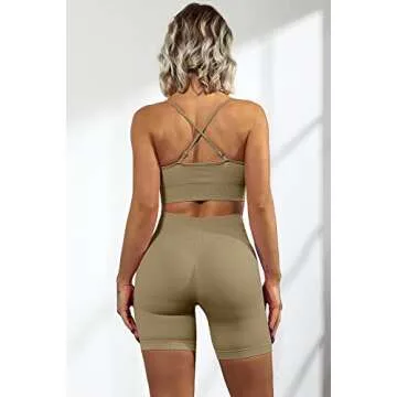 Show more Unleash your inner yogi with the QINSEN Yoga Outfits for Women 2 Piece Set. Designed for the modern woman who values both style and functionality, this chic gym ensemble features a strappy scoop neck sport bra and fitted ruched back shorts. Crafted from a premium-quality blend of breathable fabric, this set provides unmatched comfort while allowing optimal movement during your workouts. The elegant brown hue adds a touch of sophistication, making it a versatile addition to your fitness wardrobe. Whether you're hitting the studio, running outdoors or indulging in a relaxing yoga session, this outfit perfectly complements your active lifestyle.