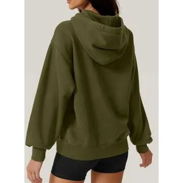 QINSEN Cozy Zip Up Hood Jacket - Drawstring Oversized Women's Hoodie in Army Green