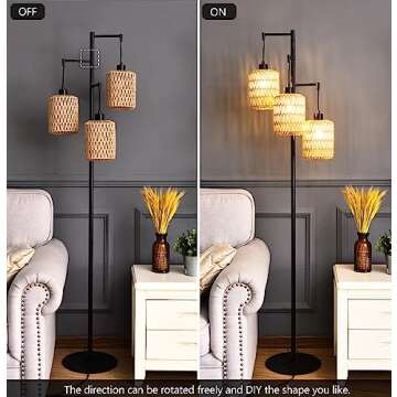 QIYIZM Floor Lamp for Living Room,Bedroom,3-Lights Boho Rattan Tree Floor Lights,Industrial Black Farmhouse Standing Lamp Wicker Rustic Tall Lamp,Woven Bamboo LampShade Floor Lamps Bohemian