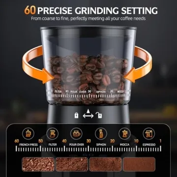 The QJA Burr Coffee Grinder features 60 grind settings for precise adjustments.