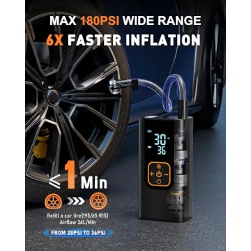 Introducing the QKMPOM 180PSI Tire Inflator Portable Air Compressor - your ultimate solution for rapid tire inflation. With a high-performance 25,000RPM motor and advanced pump core technology, this compact powerhouse inflates your car tires safely and swiftly, delivering an impressive airflow of 36L/min. Just imagine being able to refill a car tire (225/75 R17) from 28PSI to 36PSI in less than one minute! This air pump stands out for its...