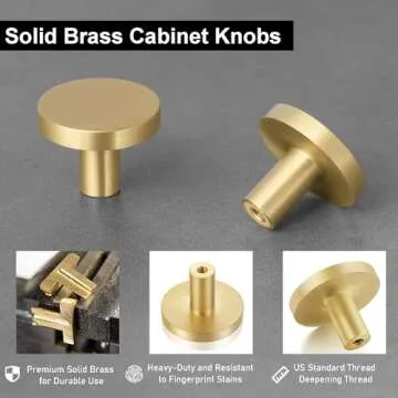 Show moreIntroducing the QOGRISUN 10-Pack Solid Brass Cabinet Knobs, your ultimate solution to instantly elevate the look of any cabinet or dresser in your home. Crafted from high-quality solid brass with a stunning brushed gold finish, these knobs effortlessly combine modern design elements with timeless elegance. Weighing a substantial 1.2 ounces (33g), they offer both durability and a luxurious feel, ensuring that each pull delivers a satisfying experience. Perfectly sized with a diameter of 1-1/8 inches and a projection of 3/4 inches, these knobs fit seamlessly with most cabinet styles, making them an excellent choice for your kitchen, bathroom, living room, or any other furniture piece in need of a stylish upgrade.