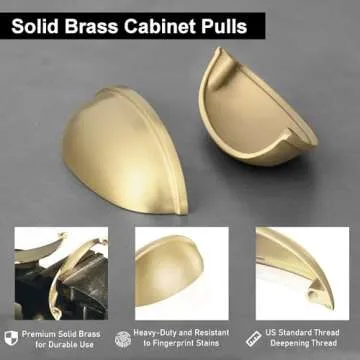 QOGRISUN 5-Pack Solid Brass Cabinet Bin Pulls,Gold Cup Drawer Dresser Handles,3-Inch Hole Center, 3-3/5-Inch Overall Length,Kitchen Cupboard Konbs Hardware, Brushed Brass Finish