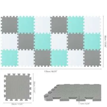 Show moreIntroducing the qqpp EVA Rubber Interlocking Puzzle Foam Floor Mats, a premium solution for creating a safe, comfortable, and vibrant space for your little ones to play and explore. Each set comes with 18 interlocking square mats, each measuring 11.8 inches by 11.8 inches, covering an impressive 16 square feet of area when fully assembled. Designed with quality and safety in mind, these mats are made from high-quality EVA foam, ensuring they are BPA-free, phthalate-free, and lead-free, making them non-toxic and perfect for your child's play areas. The stylish colors of white, green, and gray blend seamlessly into any home decor, while the cushioned surface provides added safety for little hands and feet.