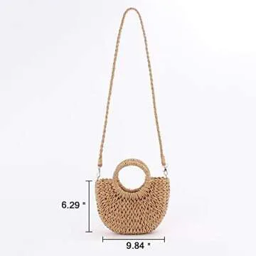 Show moreIntroducing the QTKJ Mini Semi-circle Rattan Straw Handbag, your new go-to accessory for every summer occasion! Crafted from 100% handmade rattan, this enchanting beach tote measures a compact 6.29''x 9.84'', making it perfect for quick outings while still being spacious enough to hold all your essentials. The stylish semi-circle shape paired with a chic drawstring closure will elevate your ensemble, enabling you to stride with confidence, whether you're heading to brunch, a beach day, or a tropical getaway.