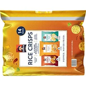 Show moreDiscover the delightful crunch of Quaker Rice Crisps Savory Variety Pack, featuring 14 single-serve bags that are perfect for on-the-go snacking. This enticing assortment includes 4 bags of Sweet Barbecue, 4 bags of Buttermilk Ranch, and 6 bags of Cheddar, appealing to every palate with flavors that are both savory and satisfying. Each rice crisp is made with a wholesome blend of corn and whole grain brown rice, expertly popped to deliver a light and crispy texture without the frying, ensuring a guilt-free indulgence. With a commitment to healthy snacking, these crisps are gluten-free and free from high fructose corn syrup, making them an ideal choice for health-conscious consumers.