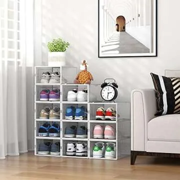 Show more Imagine a clutter-free space where every pair of shoes is easily accessible! Our Multipurpose Stackable Shoe Storage Box is designed to revolutionize your shoe organization experience. Merging functionality and style, this box showcases a sleek transparent plastic design combined with breathable ventilation holes, ensuring your shoes remain fresh and tidy. Measuring 13(L) x 9(W) x 5.5(H) inches, it holds up to 9 men's shoes or 11 women's shoes, making it a fantastic solution for both casual sneakers and evening heels.